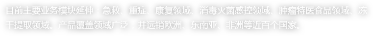 目前主要業(yè)務(wù)模塊延伸:急救、重癥、康復(fù)領(lǐng)域、消毒滅菌感控領(lǐng)域、腫瘤特醫(yī)食品領(lǐng)域、凍干提取領(lǐng)域。產(chǎn)品覆蓋領(lǐng)域廣泛,并遠(yuǎn)銷(xiāo)歐洲、東南亞、非洲等近百個(gè)國(guó)家。